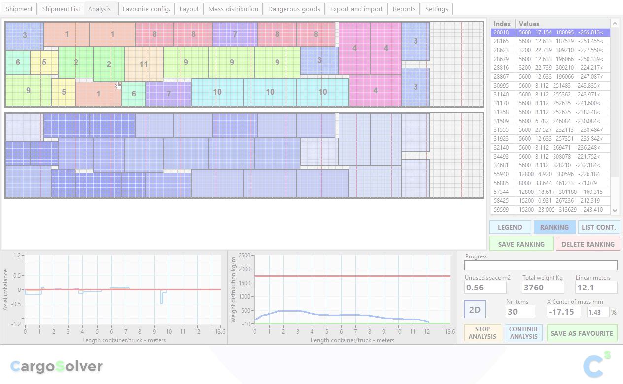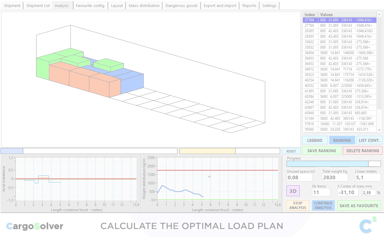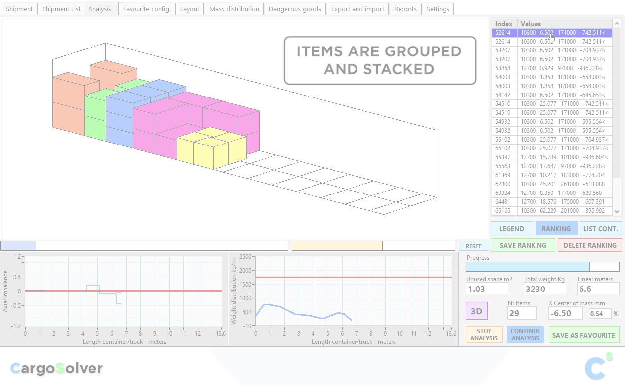 CargoSolver finds and analyzes the best load plans by optimizing several parameters: space used, weight distribution, load priority, groupings.