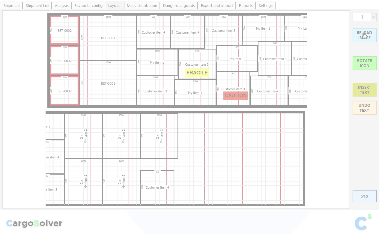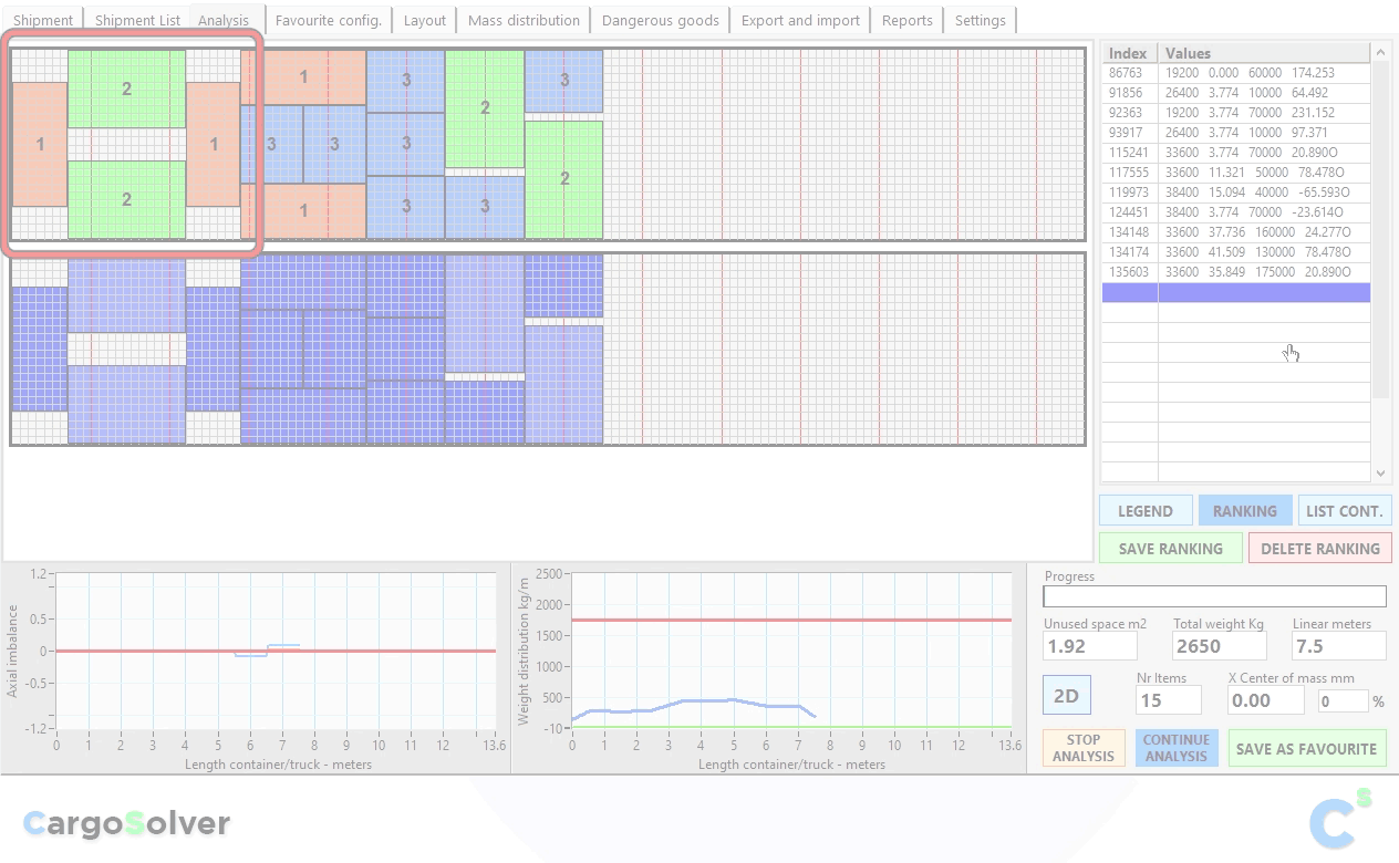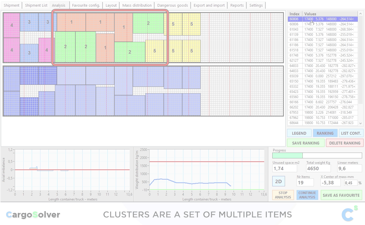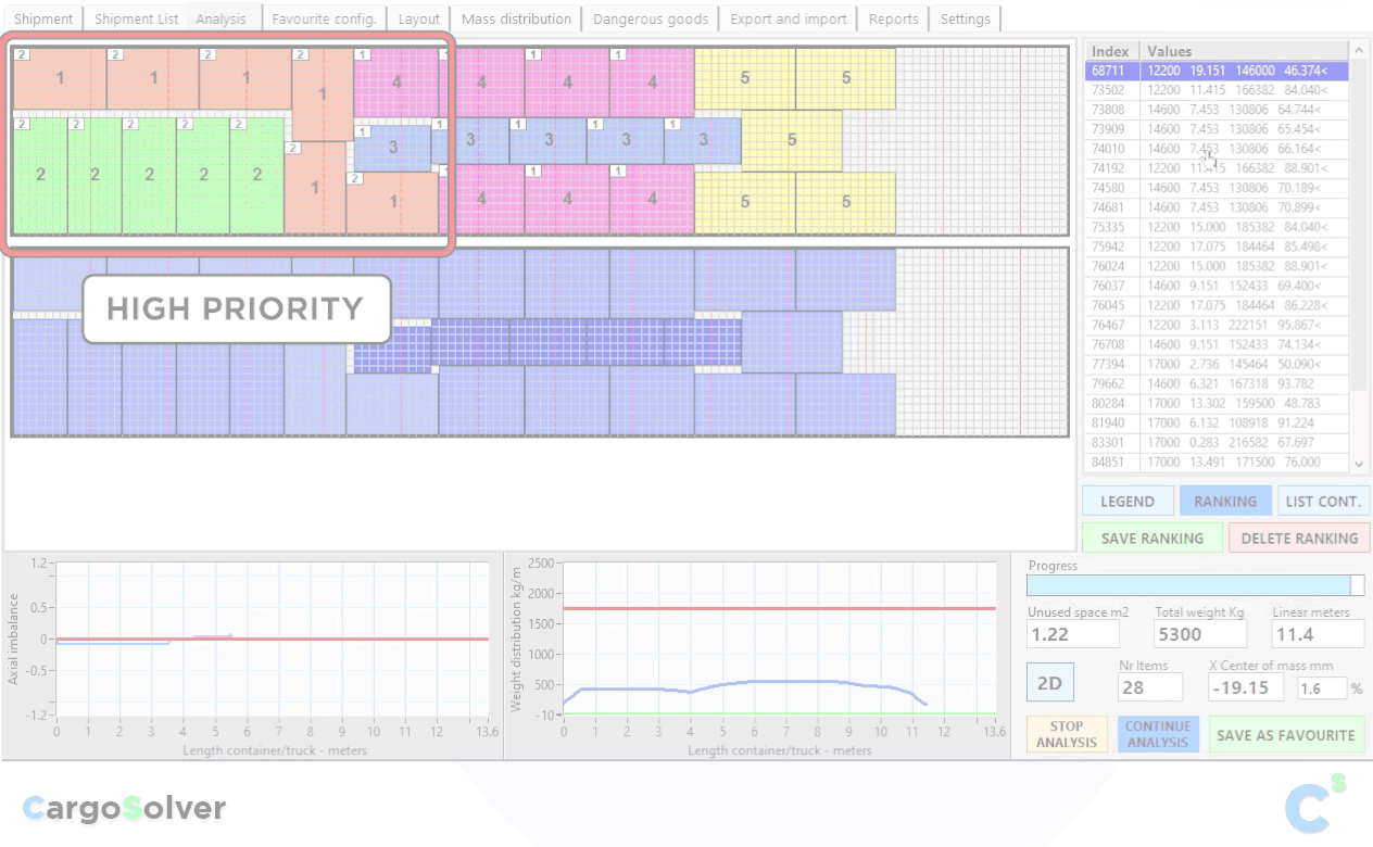 CargoSolver finds and analyzes the best load plans by optimizing several parameters: space used, weight distribution, load priority, groupings.